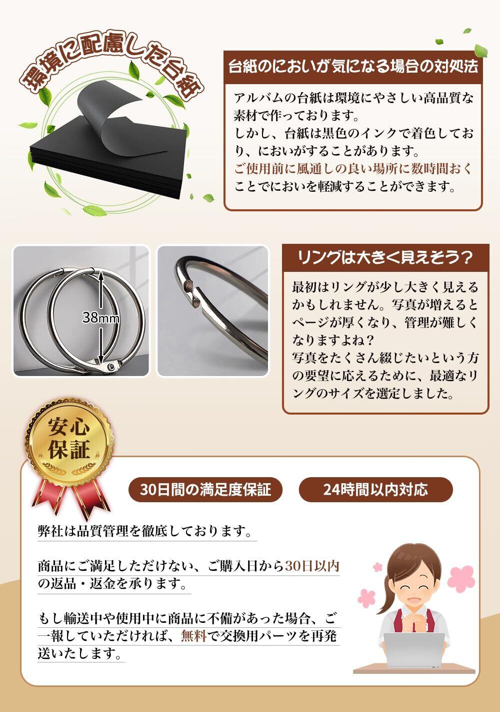 【心のこもったデザイン】アルバムには黒い台紙が39枚ついており、たくさんの写真を保存することができます、台紙の不足を心配する必要はありません。アルバムは2つのリングで綴じられており、簡単に取り外すことができ、自由に台紙を交換または追加することができます。