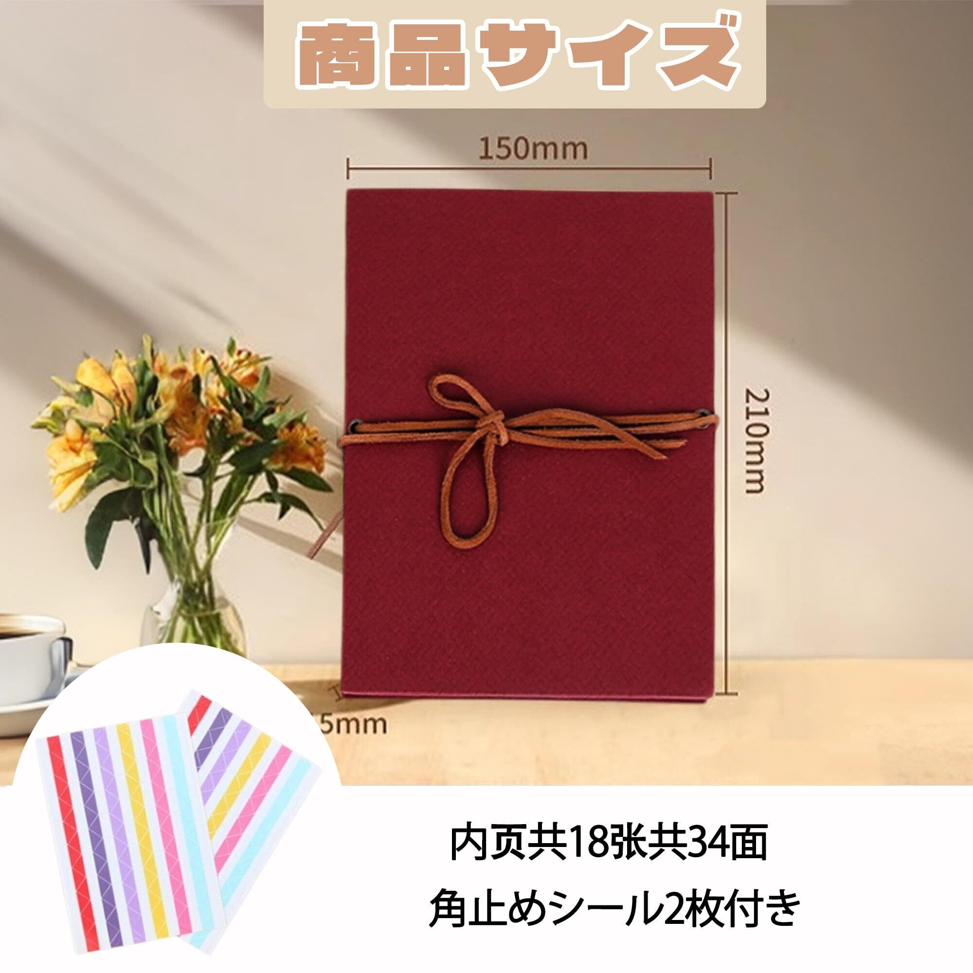 【商品詳細】アルバム 手作りはカバーサイズは21×15センチメートル、内ページサイズは19.5×13.2センチメートルで、アルバム(18折り34ページ)×1冊、コーナーシール×2枚。牛紙/黒紙の2種類の色展開があり、シンプルで様々な用途に適しています。*包装を開けてください。紐は中ページに挟まれています。
